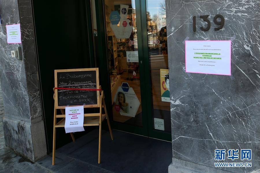 3月18日,在比利時布魯塞爾,一家藥店張貼的說明提示最多容納2名顧客同時進(jìn)入。 新華社記者 張鋮 攝