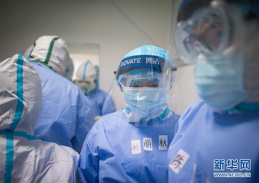 3月19日,在武漢市肺科醫(yī)院清潔區(qū),浙江醫(yī)療隊(duì)隊(duì)員孫麗秋(中)在穿戴防護(hù)服。 新華社記者 肖藝九 攝