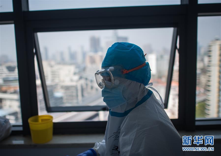 3月19日,在武漢市肺科醫(yī)院隔離病房,海南醫(yī)療隊隊員詹才露在現(xiàn)場忙碌。 新華社記者 肖藝九 攝