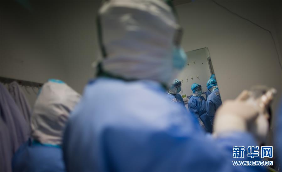 3月19日,在武漢市肺科醫(yī)院清潔區(qū),浙江醫(yī)療隊隊員在穿戴防護服。 新華社記者 肖藝九 攝