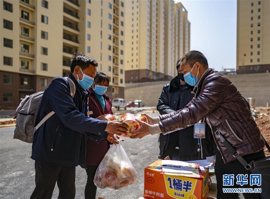 云南省永善縣大興鎮(zhèn)駱丘村村民晏付高(左一)和妻子王大香(左二)抵達(dá)魯?shù)榭h卯家灣,當(dāng)?shù)卣疄槊恳粦?hù)抵達(dá)的老百姓都準(zhǔn)備了當(dāng)日所需的生活用品(3月15日攝)。 新華社記者 江文耀 攝