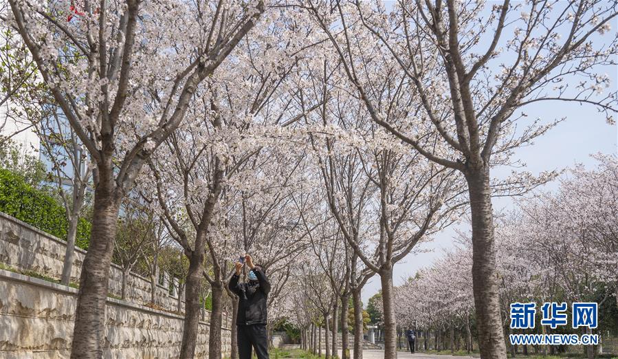 3月19日,在武漢市武昌區(qū)被網(wǎng)友稱為“武漢最美停車場”的湖北日報(bào)停車場,一名工作人員在拍攝櫻花。  新華社記者 才揚(yáng) 攝