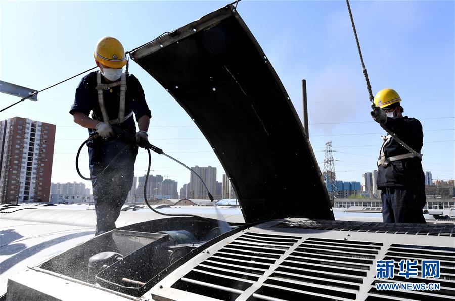 3月19日,鄭州車輛段客車檢車員在對客車空調(diào)機組蒸發(fā)器、壓縮機等內(nèi)部設(shè)備進行清洗。新華社記者 李安 攝