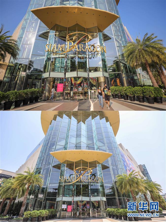 這是3月21日拍攝的泰國(guó)曼谷暹羅百麗宮商場(chǎng)(上圖)和3月22日拍攝的停止?fàn)I業(yè)的商場(chǎng)的對(duì)比圖。新華社記者張可任攝