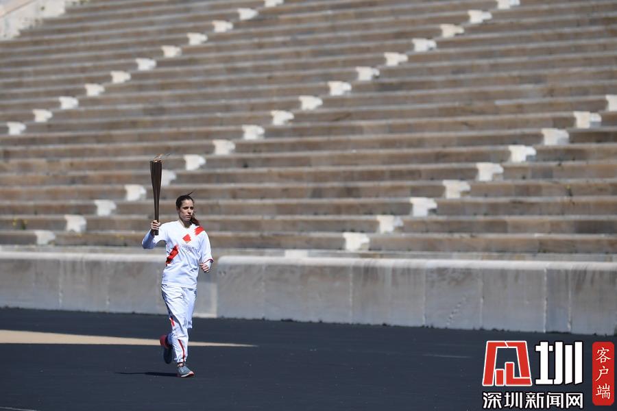 3月19日,最后一名火炬手里約奧運(yùn)會(huì)女子撐桿跳高冠軍、希臘運(yùn)動(dòng)員卡特琳娜·斯特凡尼季手持圣火火炬跑向終點(diǎn)。