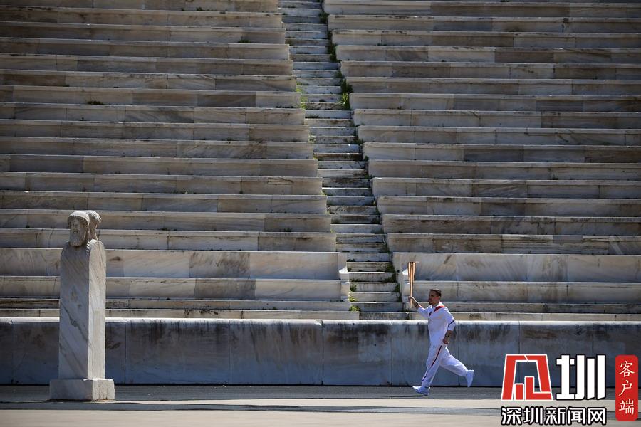 3月19日,希臘藝術(shù)體操運(yùn)動員埃萊夫塞里奧斯·彼得羅尼亞斯手持圣火火炬跑入體育場。