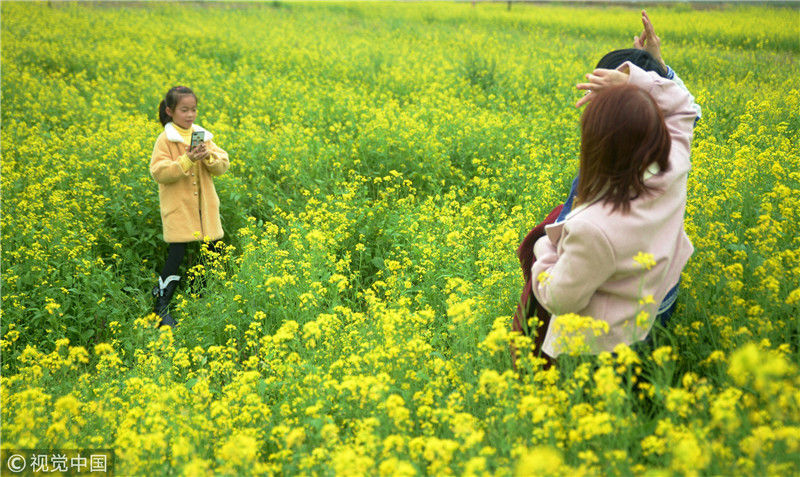 2019年2月5日,廣西來(lái)賓,當(dāng)天是農(nóng)歷大年初一,人們?cè)谛贸强h城關(guān)鎮(zhèn)隆光村油菜花海中賞花游玩。
