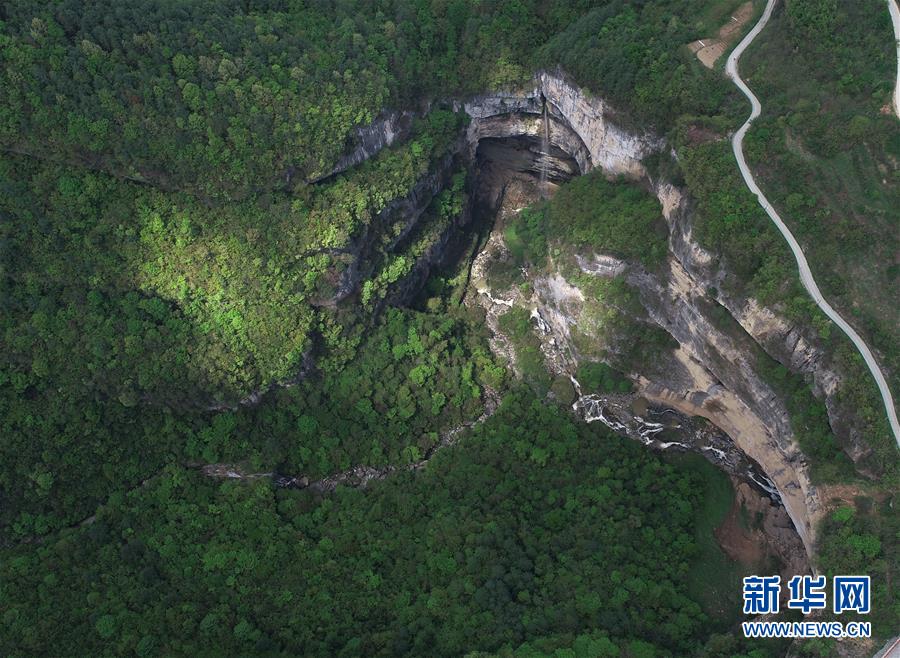 4月22日無(wú)人機(jī)拍攝的地洞河天坑。新華社記者張博文攝