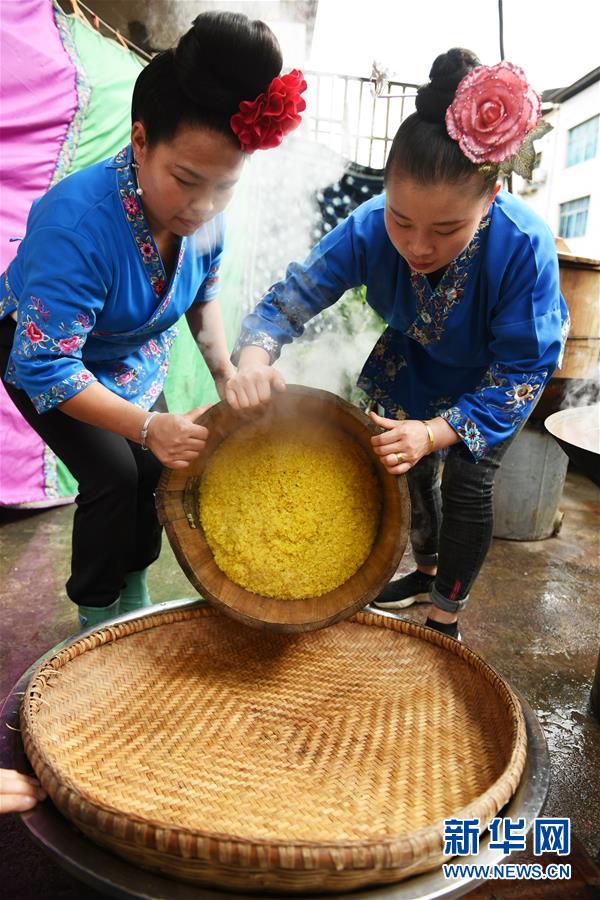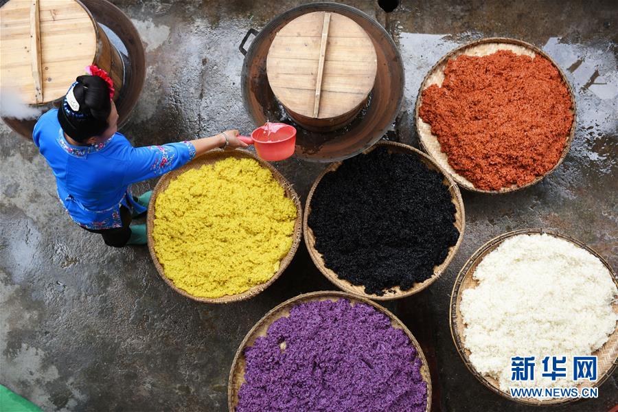 4月17日,在貴州省臺江縣姊妹街哆蝶五彩姊妹飯體驗店,苗家婦女在蒸煮五彩“姊妹飯”。新華社記者楊文斌攝