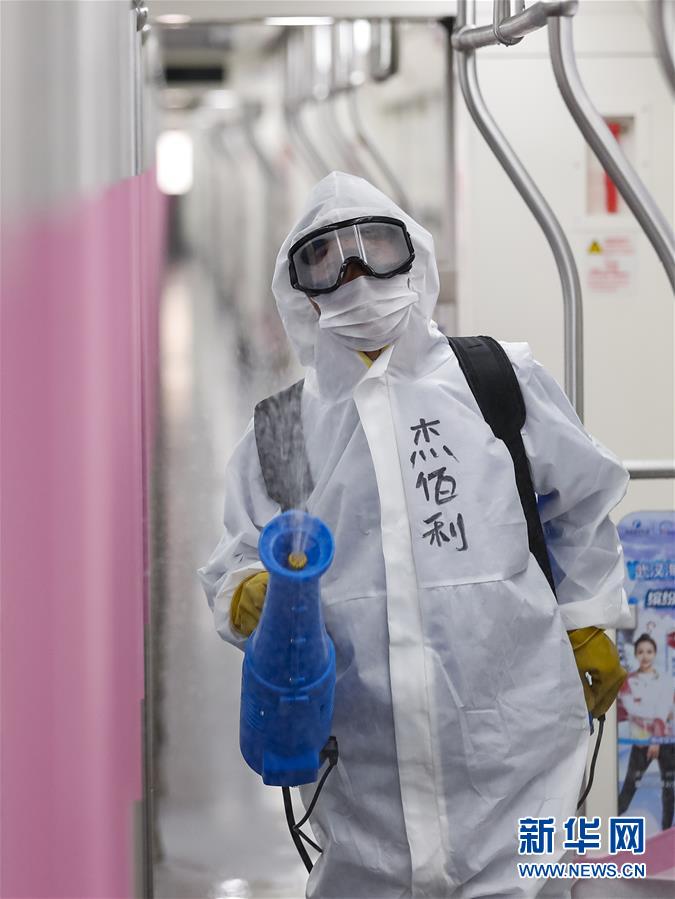 3月23日,在武漢地鐵常青車輛段,保潔人員為地鐵列車消毒。新華社記者沈伯韓攝