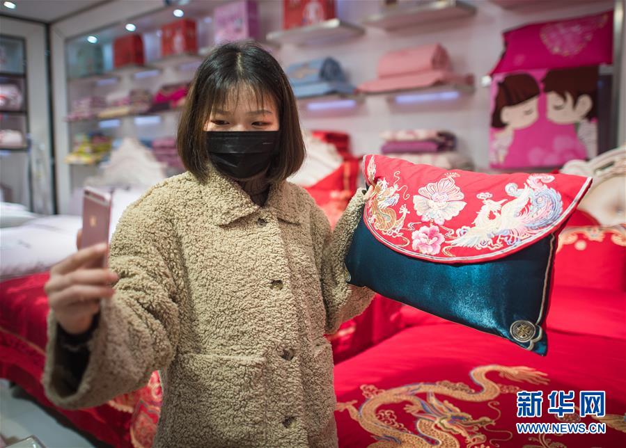 3月29日,在漢口北市場,一名主播在直播平臺直播銷售床上用品。新華社記者肖藝九攝