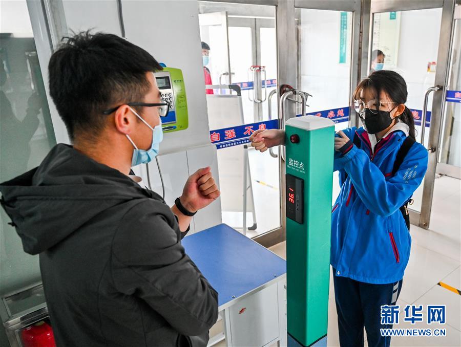 3月30日,呼和浩特市第三十五中學(xué)初三年級(jí)學(xué)生進(jìn)入教學(xué)樓時(shí)測(cè)量體溫。當(dāng)日,內(nèi)蒙古自治區(qū)全區(qū)高三和初三年級(jí)開(kāi)學(xué)復(fù)課。新華社記者連振攝