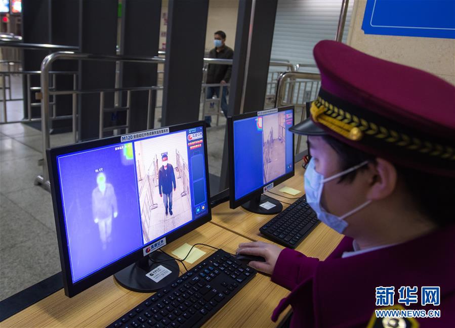 3月23日,在漢口火車站地鐵站,工作人員在測(cè)試測(cè)溫系統(tǒng)。該車站的2個(gè)入口處,已經(jīng)安裝了電子測(cè)溫儀器,只要有乘客通過,就會(huì)在電腦顯示屏上出現(xiàn)體溫的數(shù)據(jù),監(jiān)控進(jìn)站乘客體溫。新華社記者肖藝九攝