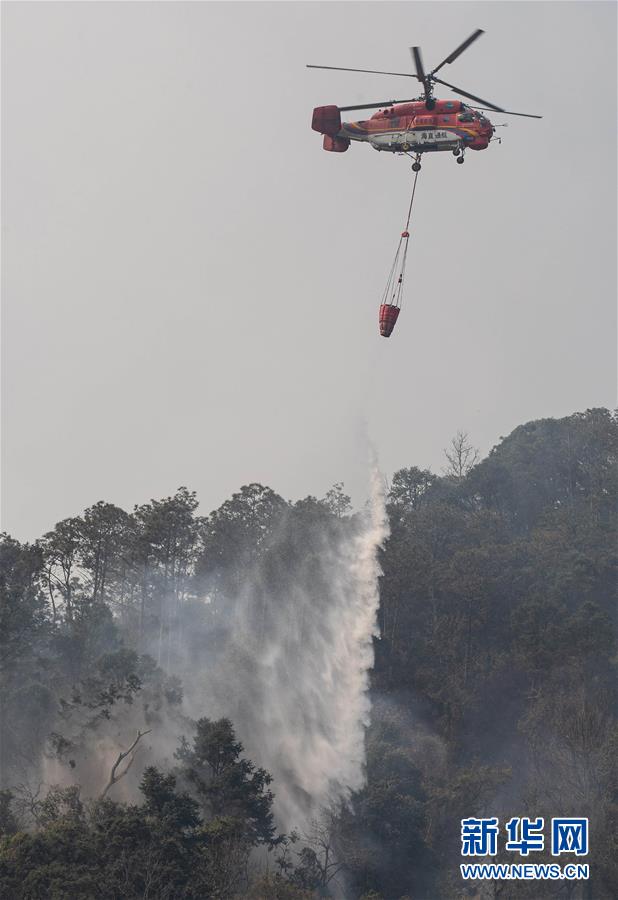 4月1日,一架卡-32大型直升機在西昌森林火災現場撲火。新華社記者江宏景攝