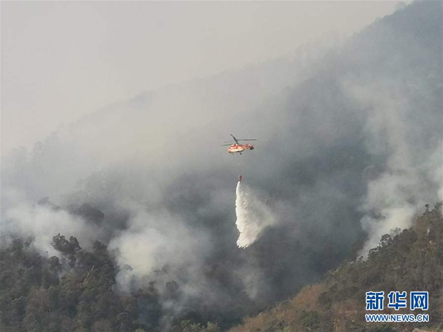 4月1日,救火直升機在西昌森林火災現場滅火(手機拍攝)。新華社記者惠小勇攝