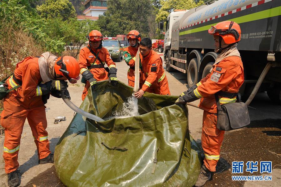 4月1日,在西昌市邛海瀘山景區(qū)臥云山莊旁,消防隊員在儲水。新華社記者胥冰潔攝