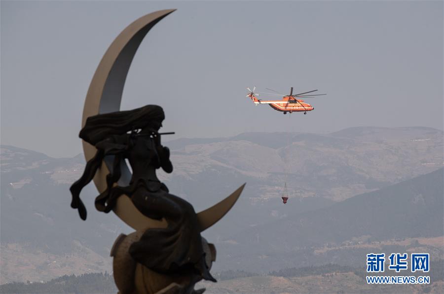 3月31日,在四川省西昌市,救火直升機從邛海取水。新華社記者惠小勇攝