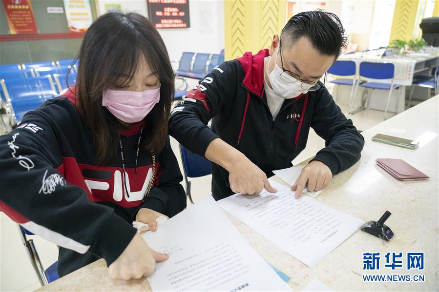 4月7日,在武漢市江岸區(qū)民政局婚姻登記處,陳先生與張女士辦理結(jié)婚登記手續(xù)時按手印。 新華社記者才揚攝