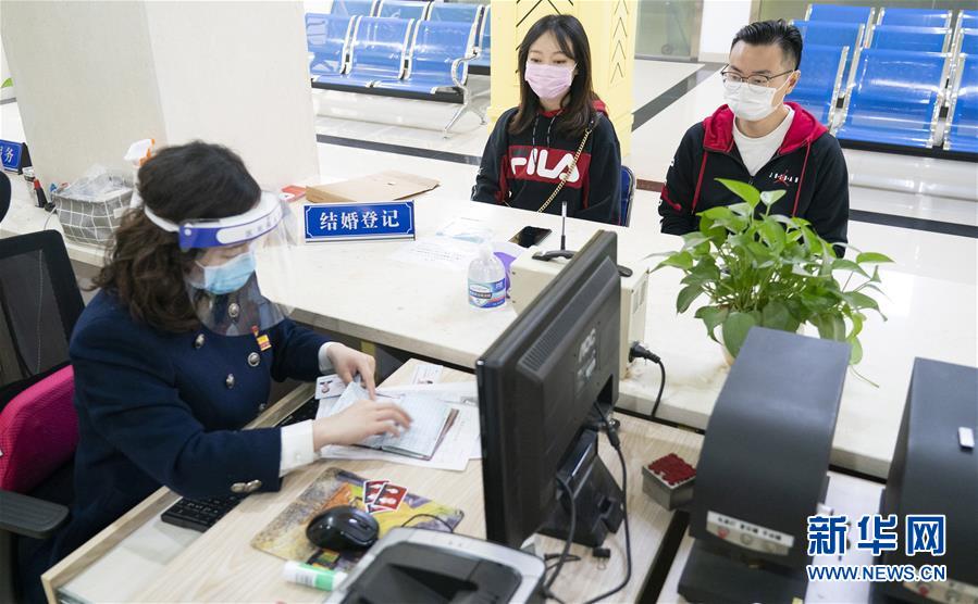4月7日,在武漢市江岸區(qū)民政局婚姻登記處,新人陳先生與張女士辦理結(jié)婚登記手續(xù)。 新華社記者才揚攝