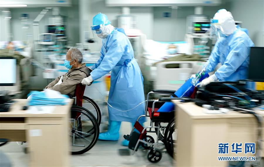 3月20日,武漢火神山醫(yī)院重癥醫(yī)學一科副主任宋立強(中)護送81歲的新冠肺炎重癥患者去做CT檢查。為確?;颊哂谐渥愎┭?,醫(yī)生胡世頡推著氧氣瓶隨行。 新華社記者 王毓國 攝