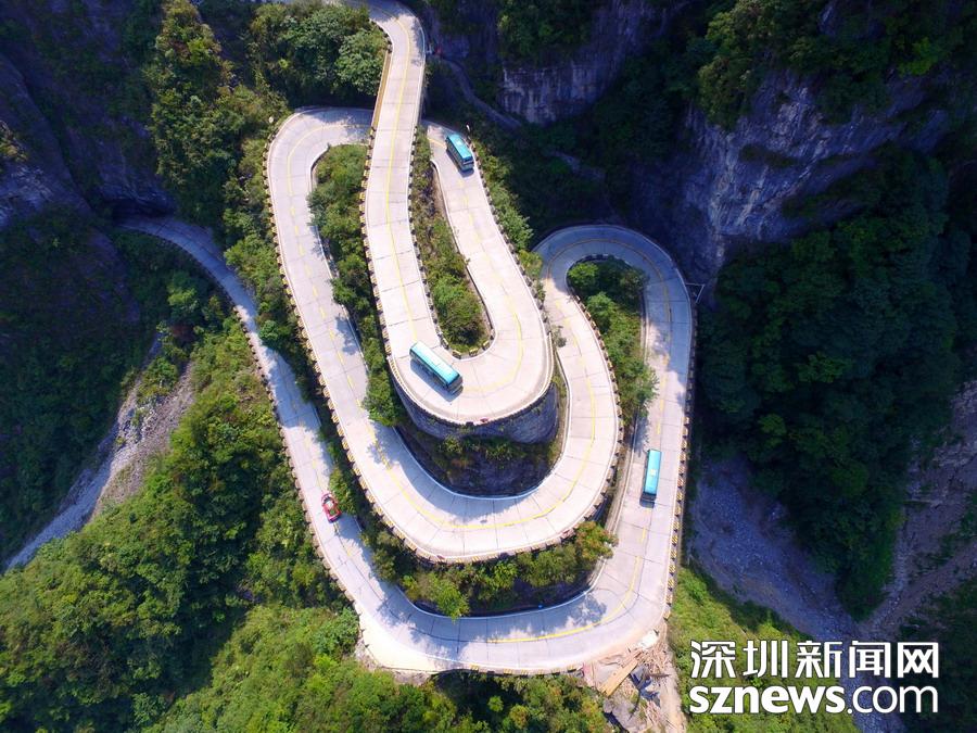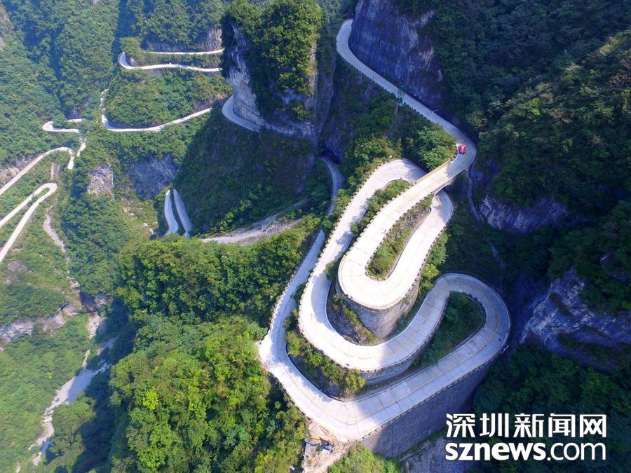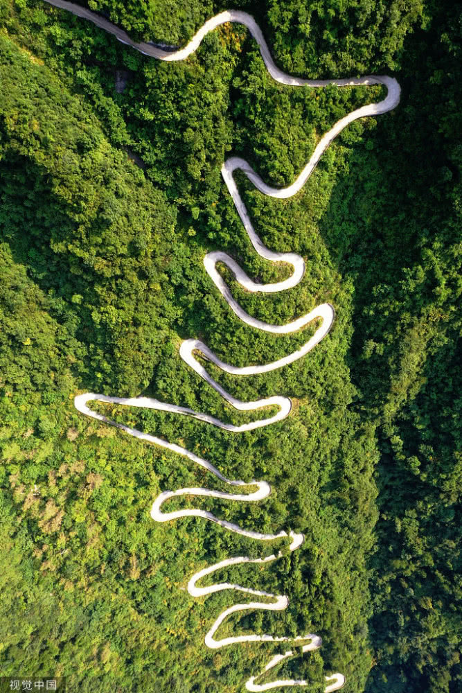 天門山盤山公路位于湖南省張家界市境內(nèi)的國(guó)家森林公園天門山上,盤山公路全長(zhǎng)10.77公里,海拔從200米急劇提升到1300米,大道兩側(cè)絕壁千仞,空谷幽深,共計(jì)99個(gè)彎,180度急彎此消彼長(zhǎng),似玉帶環(huán)繞,航拍鏡頭下蜿蜒曲折的道路彎彎緊連,層層迭起,宛如迷宮般的“納斯卡線條”,被譽(yù)為“天下第一公路奇觀”,同時(shí)它也是世界上最危險(xiǎn)的十大公路之一。