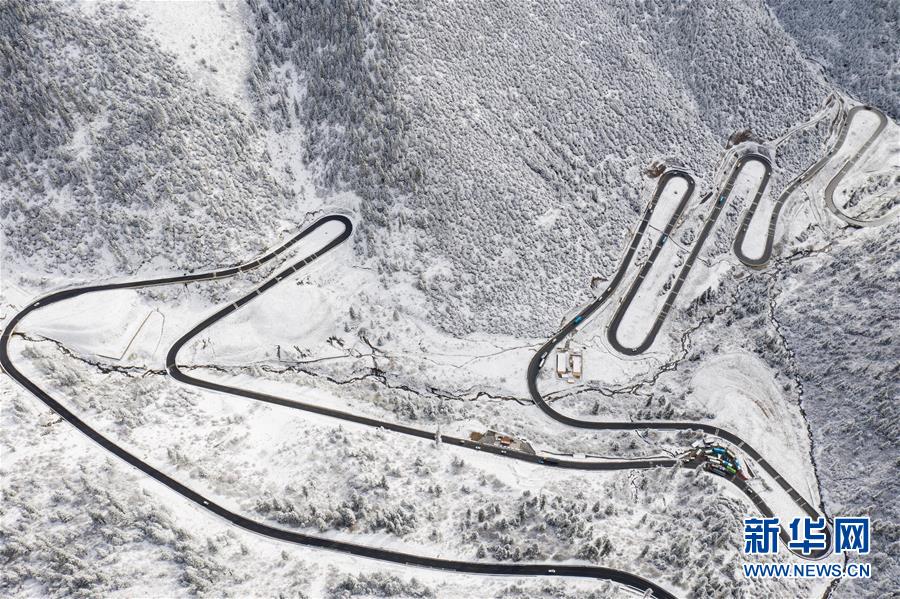 這是318國(guó)道剪子彎山段,大雪過后銀裝素裹(10月17日無人機(jī)拍攝)。新華社記者江宏景攝