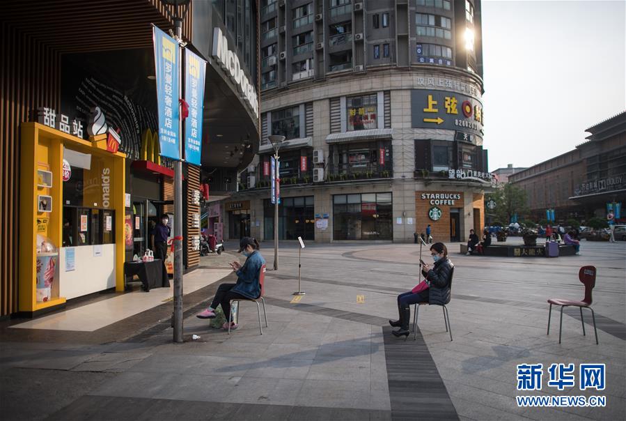 4月8日,顧客在江漢路步行街一家甜品店門前排隊。新華社記者肖藝九攝