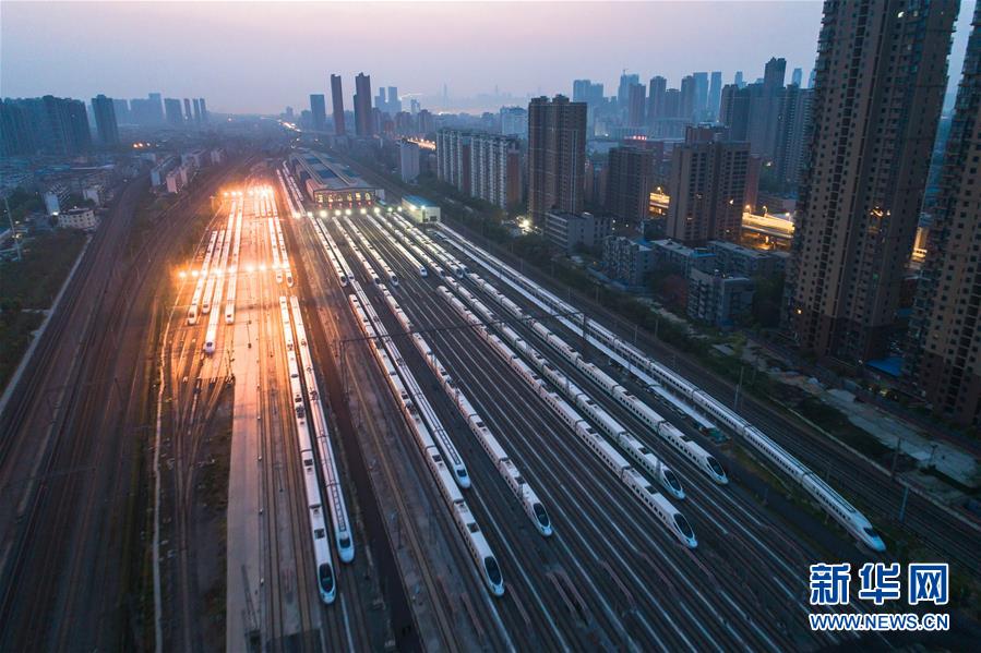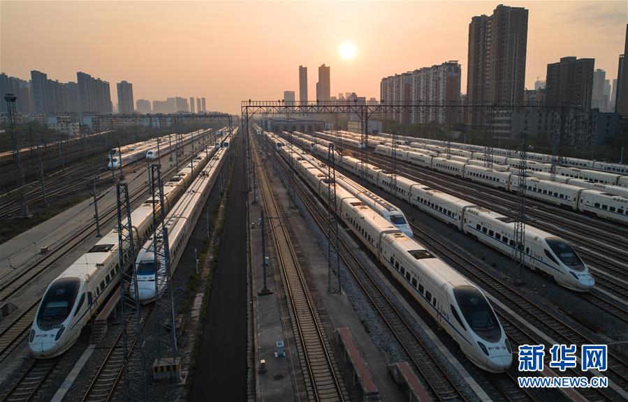 4月8日,在武漢動(dòng)車(chē)段,列車(chē)??吭诖孳?chē)線(xiàn)上準(zhǔn)備投入運(yùn)行(無(wú)人機(jī)照片)。新華社記者肖藝九攝