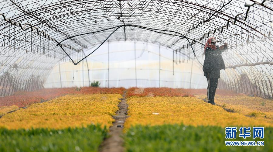 4月13日,在八角臺(tái)街道雅化村花圃內(nèi),花農(nóng)苗景香修理噴淋器。新華社記者姚劍鋒攝