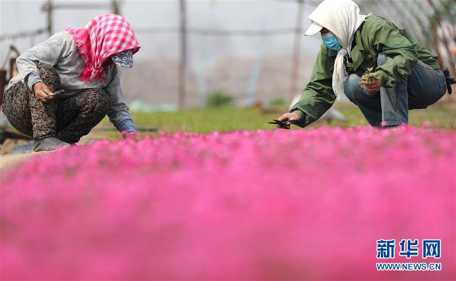 4月13日,在八角臺(tái)街道雅化村花圃內(nèi),花農(nóng)為宿根花卉除草。新華社記者姚劍鋒攝