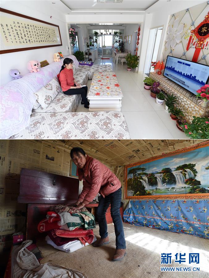 拼版照片:上圖為胥存坐在古浪縣綠洲生態(tài)移民小城鎮(zhèn)的家中客廳看電視(3月10日攝);下圖為胥存在古浪縣黃羊川鎮(zhèn)石城村收拾屋中物品(2018年2月6日攝)。新華社記者范培珅攝