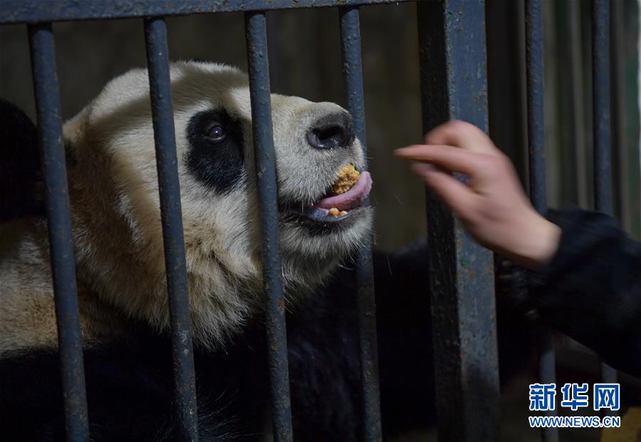 4月14日,中國大熊貓保護研究中心核桃坪基地飼養(yǎng)員周季秋用投喂窩窩頭的方法訓(xùn)練大熊貓“喜妹”。新華社記者張超群攝