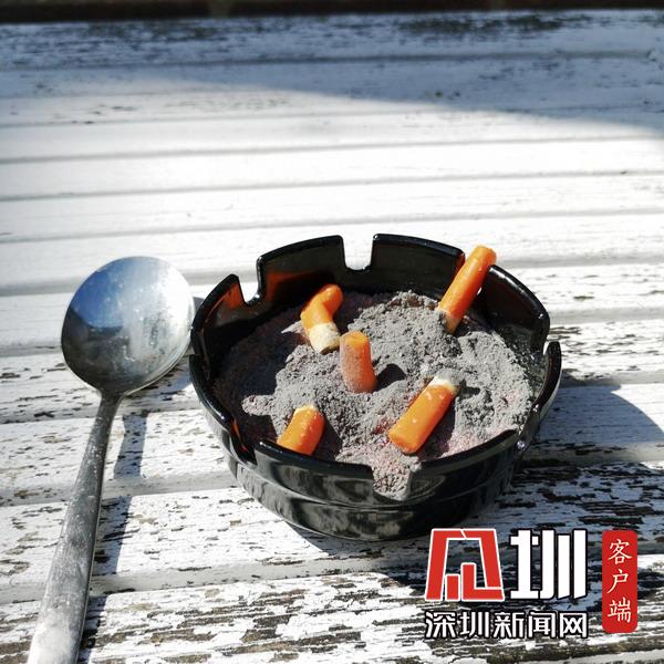 “煙灰缸”奶酪。煙灰缸內(nèi)放置著瓦尼拉蔓越莓慕斯,巧克力還有蛋白粉末制作的煙頭煙灰。