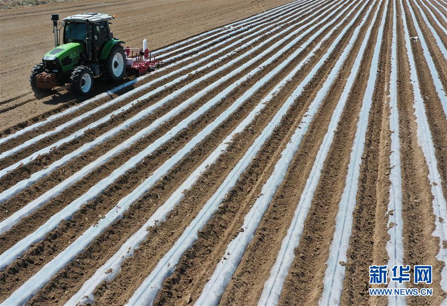 4月25日,灤南縣東黃坨鎮(zhèn)新戶村農(nóng)民使用拖拉機給準備栽植煙薯秧苗的土地開溝覆膜(無人機照片)。近年來,河北省灤南縣利用當?shù)赝寥篮蜌夂蛱攸c,引導(dǎo)農(nóng)民因地制宜發(fā)展煙薯種植,取得良好效果。目前該縣煙薯種植面積達3萬多畝,每畝年收入達5000多元。新華社記者楊世堯攝