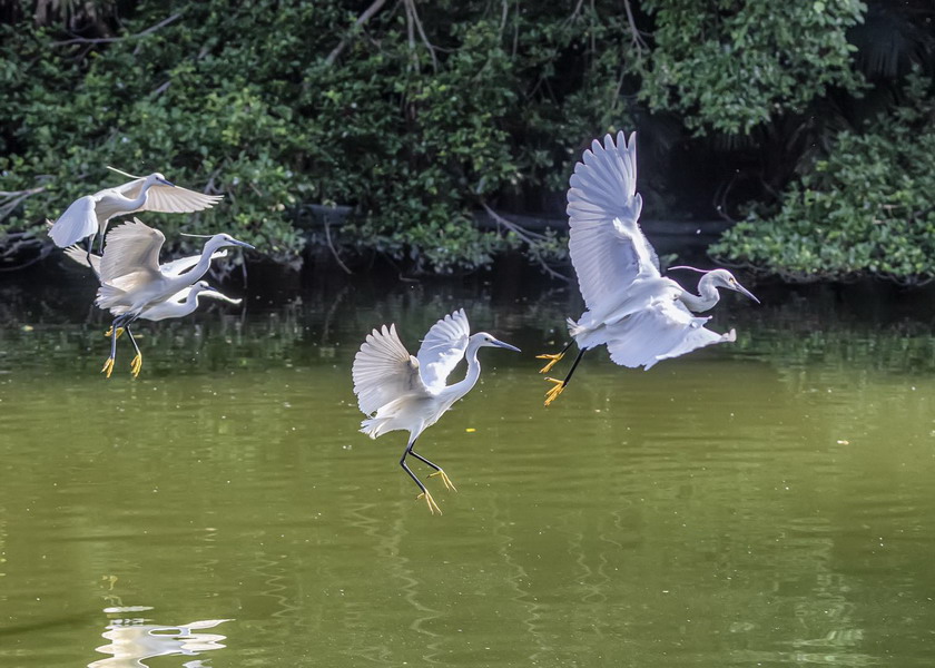4月15日,攝于南山區(qū)華僑城天鵝堡附近。這是深圳拍鷺鳥的其中一個好去處。四只白鷺在水面上爭相捕食。徐捷攝