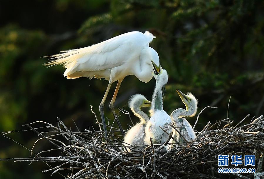 在南昌市新建區(qū)象山森林公園內(nèi),一只白鷺在鳥(niǎo)巢內(nèi)給幼鳥(niǎo)喂食(4月27日攝)。近日,在江西省南昌市新建區(qū)象山森林公園內(nèi),已安家筑巢的大批白鷺進(jìn)入繁殖旺季。在夕陽(yáng)的照耀下,白鷺時(shí)而翩翩起舞,時(shí)而展翅盤(pán)旋,構(gòu)成一幅美麗的自然生態(tài)畫(huà)卷。新華社記者萬(wàn)象攝