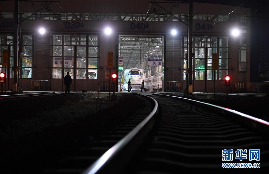 4月29日夜,合肥南動(dòng)車運(yùn)用所的工作人員對(duì)動(dòng)車組進(jìn)行檢修。每當(dāng)夜深人靜的時(shí)候,合肥南動(dòng)車運(yùn)用所卻燈火通明,“動(dòng)車安全守護(hù)者”們堅(jiān)守崗位,對(duì)動(dòng)車組進(jìn)行全面細(xì)致檢修。新華社記者 劉軍喜 攝