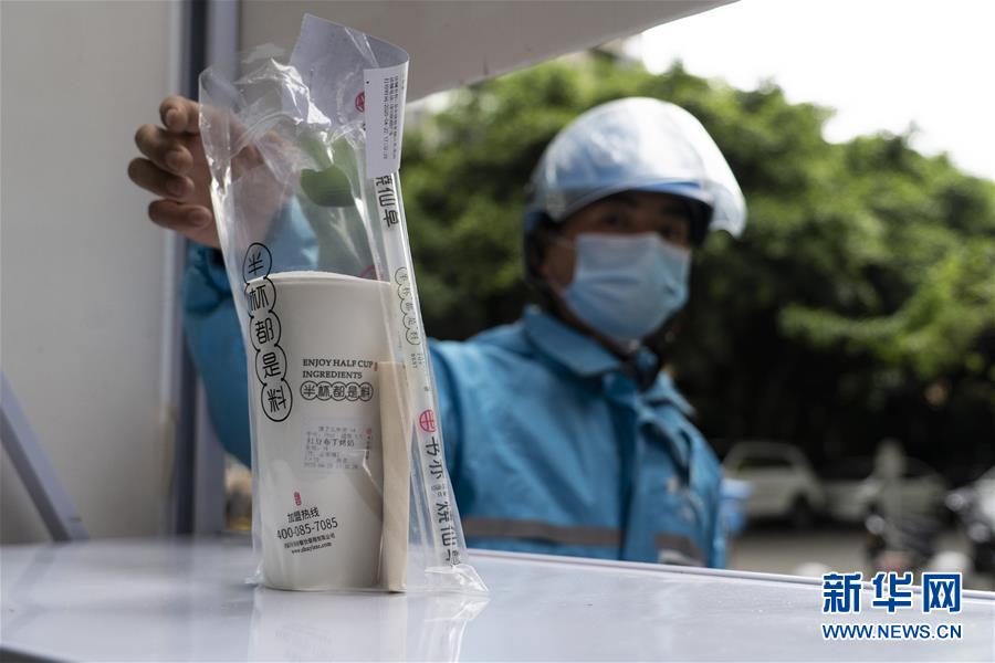 4月22日,在四川省成都市的一家小區(qū)無接觸配送點(diǎn),邱有哈子配送奶茶。新華社記者 李夢(mèng)馨 攝