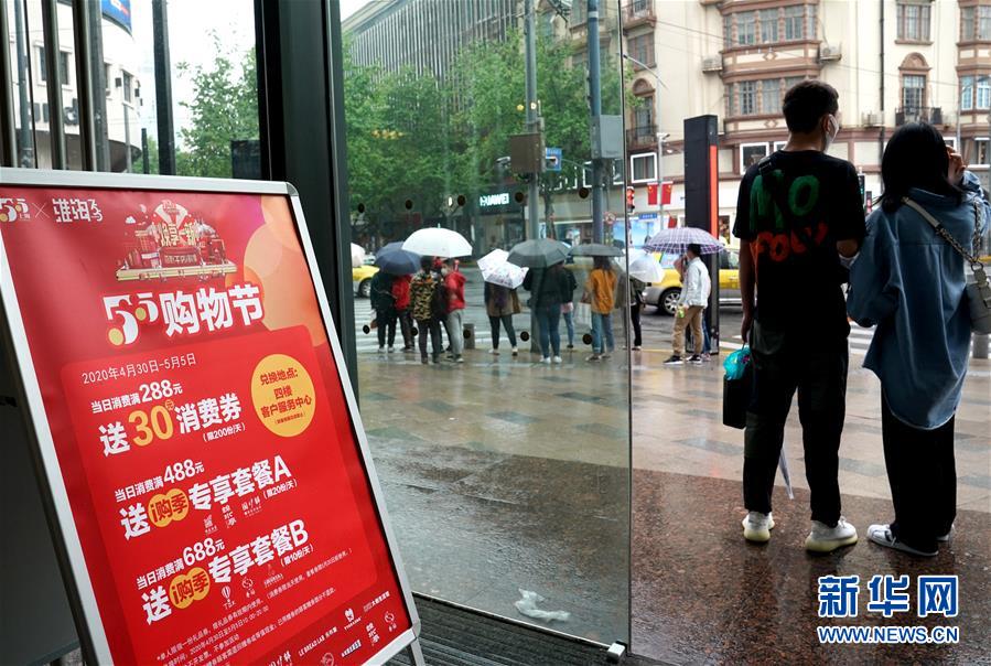 上?;春B芬患疑虉?chǎng)布置的“五五購(gòu)物節(jié)”活動(dòng)信息(5月5日攝)。5月4日晚,上海首次啟動(dòng)大規(guī)模商業(yè)促銷(xiāo)活動(dòng)“五五購(gòu)物節(jié)”,多家在線(xiàn)新經(jīng)濟(jì)企業(yè)參與,通過(guò)線(xiàn)上流量?jī)?yōu)勢(shì)反哺線(xiàn)下賣(mài)場(chǎng),實(shí)現(xiàn)電商與實(shí)體零售融合互動(dòng),激活消費(fèi)潛力、驅(qū)動(dòng)消費(fèi)復(fù)蘇。據(jù)“上海發(fā)布”的消息,截至5日14時(shí)12分,“五五購(gòu)物節(jié)”上海地區(qū)消費(fèi)支付總額已超100億元。新華社記者劉穎攝