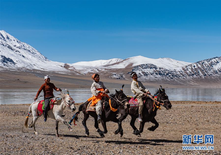 西藏那曲市尼瑪縣文部鄉(xiāng)北村的村民們騎馬在當穹錯旁角逐(4月30日攝)。新華社記者侯捷攝