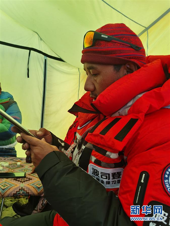 5月7日,登山隊隊長次洛在前進營地查看攀登計劃。當日,2020珠峰高程測量登山隊抵達海拔6500米的前進營地后,測量登山隊同由西藏圣山登山探險服務有限公司的高山向導和協(xié)作隊員組成的修路隊、運輸隊召開協(xié)調(diào)會議,布置下一步任務。新華社特約記者扎西次仁攝