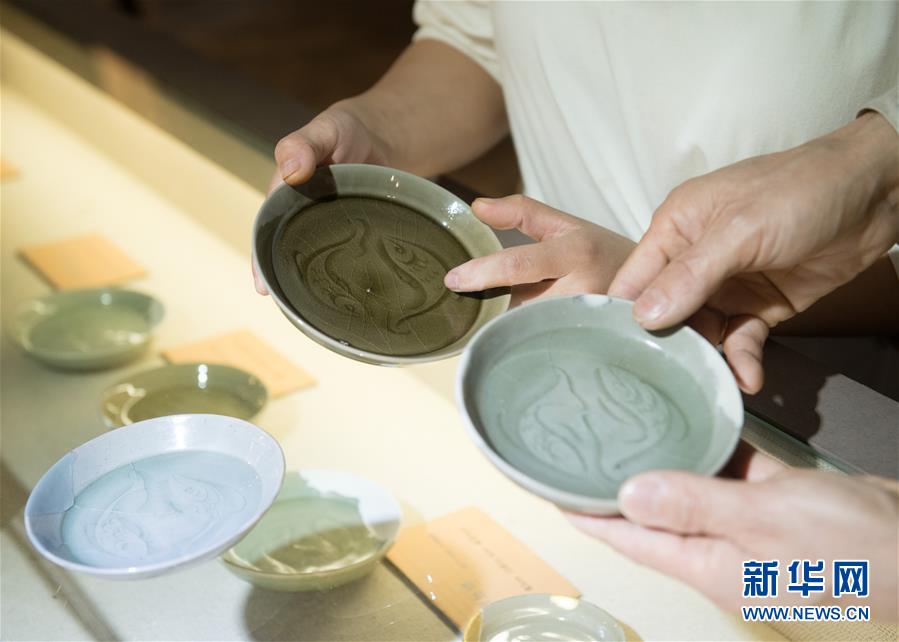 5月8日,“90后”瓷人湯佳(左)將自己制作的魚紋盤帶到龍泉青瓷裝飾紋樣研究所,跟項宏金收藏的古瓷器比對。1965年出生的項宏金,被浙江龍泉年輕一代瓷人稱為“項哥”,他從20世紀90年代開始收集龍泉青瓷標本,研究青瓷紋樣。2014年出版著作《龍泉青瓷裝飾紋樣》,次年開設(shè)龍泉青瓷裝飾紋樣研究所,將自己收藏的千余件標本跟瓷器愛好者、創(chuàng)作者免費分享。新華社記者翁忻旸攝