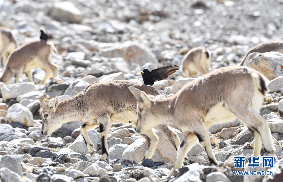黃嘴山鴉停留在巖羊身上(5月8日攝)。當(dāng)日,一群巖羊在珠峰大本營(yíng)周圍覓食,黃嘴山鴉飛到巖羊身上停留,構(gòu)成一幅幅生動(dòng)有趣的雪域圖畫。新華社記者晉美多吉攝