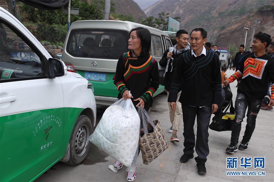5月12日,在四川省昭覺(jué)縣阿土列爾村,莫色雄體(右)坐上車準(zhǔn)備前往昭覺(jué)縣易地扶貧搬遷縣城集中安置點(diǎn)的新家。新華社記者江宏景攝