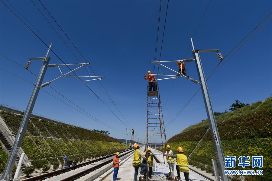 5月12日,中國鐵路上海局集團公司上海高鐵維修段的技術人員在商合杭高鐵浙江湖州段調整接觸網導線。近日,商合杭高鐵合肥至湖州段聯(lián)調聯(lián)試正有條不紊進行中。中國鐵路上海局集團公司上海高鐵維修段抽調49名精兵強將,持續(xù)對管轄范圍內的高鐵線路、信號、接觸網線進行調試,為下一階段打下基礎。據了解,商合杭高鐵合湖段聯(lián)調聯(lián)試之后將轉入運行試驗階段,驗收合格并通過安全評估后,力爭6月底具備開通運營條件。新華社記者黃宗治攝