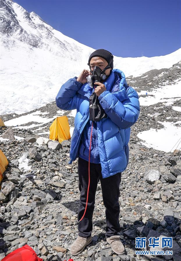 5月18日,國(guó)測(cè)一大隊(duì)沖頂隊(duì)員王偉在練習(xí)使用氧氣面罩。新華社特約記者扎西次仁攝