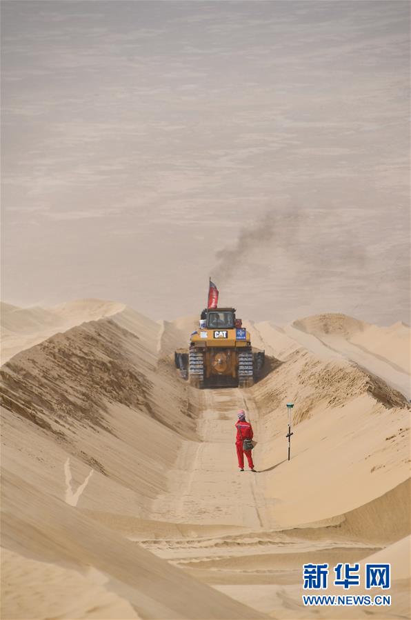 在新疆尉犁至且末沙漠公路施工現(xiàn)場,測繪員劉耀軍在工作(5月17日攝)。新華社記者宋彥樺攝