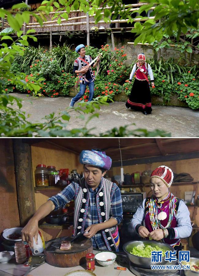 拼版照片上圖:郁伍林和魯冰花在客棧院子里彈唱歌舞(2017年5月27日攝);下圖:郁伍林和魯冰花為客人準備晚餐(2017年5月26日攝)。云南省怒江傈僳族自治州福貢縣匹河怒族鄉(xiāng)老姆登村的郁伍林和妻子魯冰花,是該村開辦農(nóng)家樂和客棧的致富帶頭人。夫妻倆還創(chuàng)建了茶葉品牌,幫助老姆登村怒族群眾把種植的生態(tài)茶葉銷往國內(nèi)外。在他們的引導和帶動下,山寨的父老鄉(xiāng)親通過經(jīng)營農(nóng)家樂客棧和種植茶葉逐步脫貧致富,日子越過越紅火。黨的十八大以來,我們堅持以人民為中心的發(fā)展思想,明確了到2020年我國現(xiàn)行標準下農(nóng)村貧困人口實現(xiàn)脫貧、貧困縣全部摘帽、解決區(qū)域性整體貧困的目標任務(wù)。目前看,脫貧進度符合預(yù)期,成就舉世矚目。這些成績的取得,凝聚了全黨全國各族人民智慧和心血,是廣大干部群眾扎扎實實干出來的。脫貧摘帽不是終點,而是新生活、新奮斗的起點。新華社記者楊宗友攝