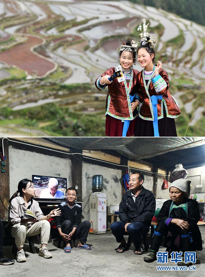 拼版照片上圖:吳賢艷(左)與村里的大一女生梁瓊英在直播推介加榜梯田風光(4月19日攝);下圖:吳賢艷(左一)夜訪貧困戶(4月18日攝)。從江縣是貴州省深度貧困縣之一。1994年出生的從江縣侗族女孩吳賢艷在2017年大學畢業(yè)后回到月亮山區(qū)。2019年3月,她成為從江縣加榜鄉(xiāng)加車村脫貧攻堅指揮所的一名網(wǎng)格員。吳賢艷和其他駐村干部不僅會主動幫助缺少勞動力的農(nóng)戶,還利用閑暇時間通過網(wǎng)絡(luò)平臺,向山外推介美麗的加榜梯田和苗寨風光,吸引更多的游客來旅游,為村民們脫貧增收出謀劃策。黨的十八大以來,我們堅持以人民為中心的發(fā)展思想,明確了到2020年我國現(xiàn)行標準下農(nóng)村貧困人口實現(xiàn)脫貧、貧困縣全部摘帽、解決區(qū)域性整體貧困的目標任務(wù)。目前看,脫貧進度符合預(yù)期,成就舉世矚目。這些成績的取得,凝聚了全黨全國各族人民智慧和心血,是廣大干部群眾扎扎實實干出來的。脫貧摘帽不是終點,而是新生活、新奮斗的起點。新華社記者楊文斌攝
