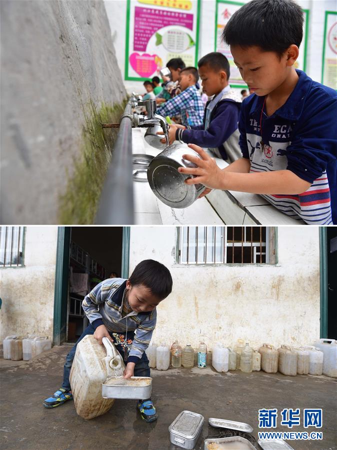 這是一張拼版照片。上圖:在大化瑤族自治縣板升鄉(xiāng)八好小學(xué),同學(xué)們在用泉水洗碗(2019年5月7日攝)。下圖:八好小學(xué)的同學(xué)們用儲(chǔ)備在水桶里的雨水淘米煮飯(2014年11月24日攝)。八好小學(xué)有400多名學(xué)生,曾僅有一個(gè)不足100立方米的水柜,用于收集儲(chǔ)存樓頂?shù)挠晁瑢W(xué)生需定期定量用水。遇到長時(shí)間不下雨,學(xué)校需要到鄉(xiāng)政府所在地運(yùn)水。如今,學(xué)校修建了5個(gè)大水柜,并從兩公里外引泉水到校園,“飲水難”問題得到解決。新華社記者黃孝邦攝